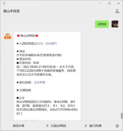 温馨提示:微信搜索公众号【唐山本地宝】,关注后在对话框回复【动物园】可获唐山动物园入园信息登记入口、开放/闭园时间、游玩攻略、交通指南等信息。